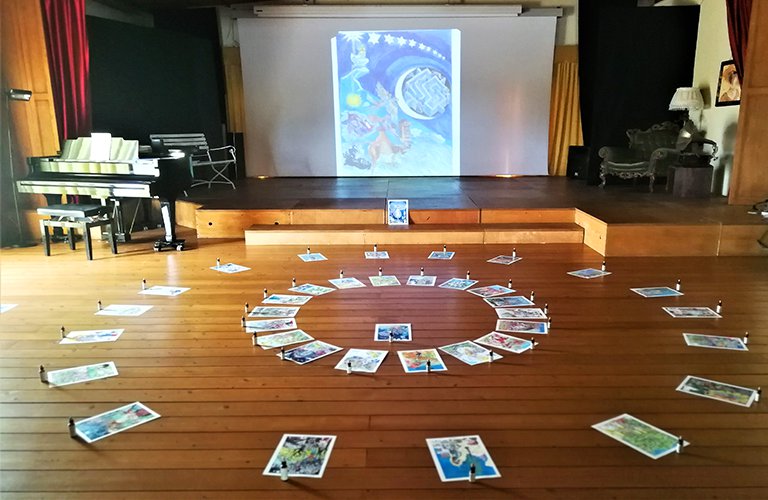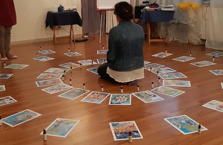 Le tavole e le essenze floreali disposte in cerchio a terra diventano sentieri di un Mandala ricco di colori e spunti narrativi, lungo i quali le persone camminano, alla scoperta di parti di Sé e della propria storia.